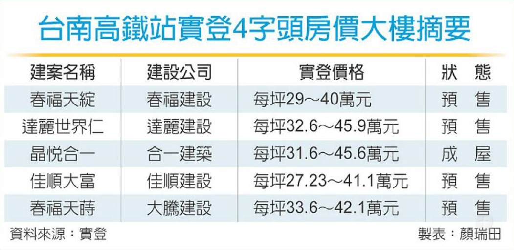 台南高鐵站生活圈包括春福天綻、達麗世界仁、佳順大富、春福天蒔等單價衝破4字頭的建案,都是預售案,三發地產的關係企業合一建築推出的「晶悅合一」,則是少數的新成屋。麥克登創意行銷負責人鍾佳峰指出,晶悅合一今年第一季完工交屋,去年底成交每坪約38萬元,目前平均成交價介於每坪42萬到43萬元間。他說,2021年在該區域推出預售的「晶悅首發」,當時每坪平均售價20萬元,而「晶悅合一」目前的實登最高價為每坪45.6萬元。鍾佳峰表示,在今年AMD台南辦公室啟用及傳出沙崙生態科學園區的設置後,也讓「晶悅合一」從去年12月迄今,分階段調漲售價累計約10%。