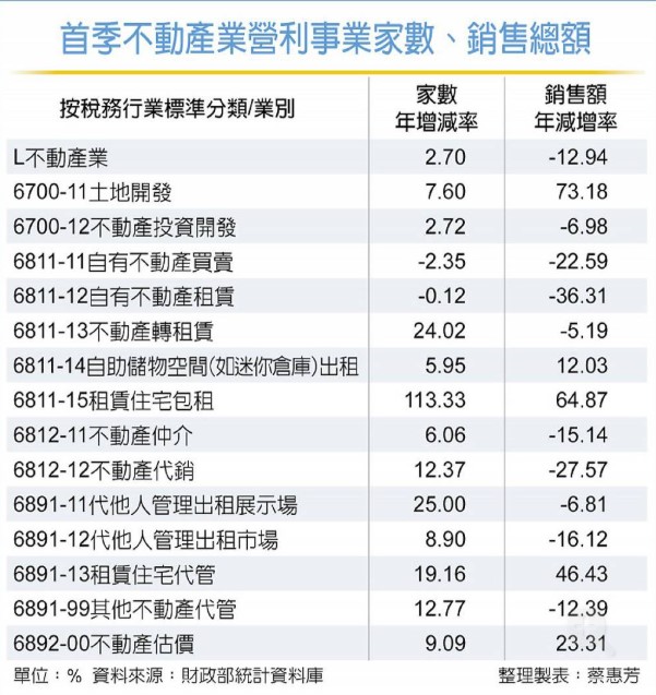 財政部第一季不動產業營利事業家數及銷售總額統計顯示,不動產業總家數比去年同期小幅成長2.7%至4.95萬家,總銷售額2,916.26億元、年減12.94%。