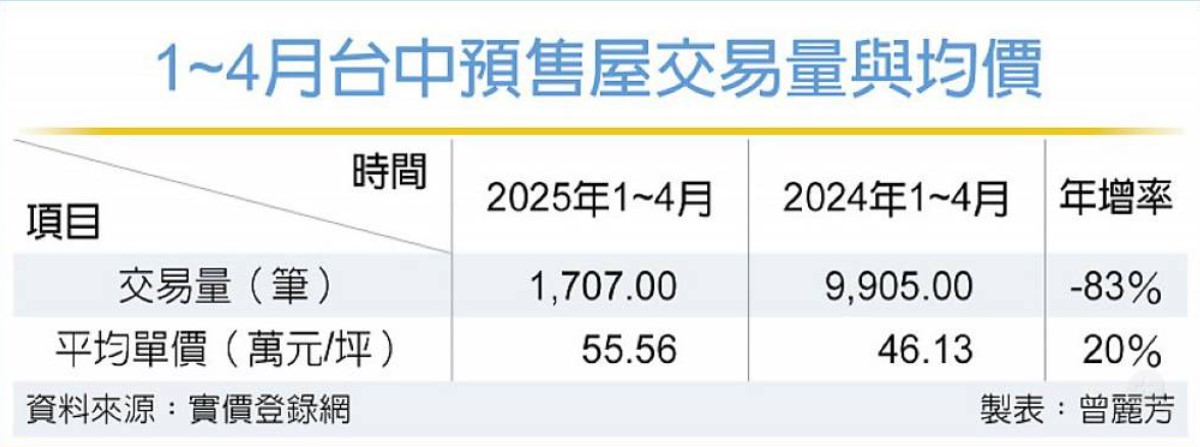 政策打房,銀行房貸審核趨嚴,抑制民眾購屋意願,台中市今年前四月預售屋交易總量僅1,707筆,較去年同期大減83%,惟房價並未之下跌,平均單價甚至攀升至每坪55.56萬元、年增2成,顯示房市已進入觀望且明顯降溫階段。