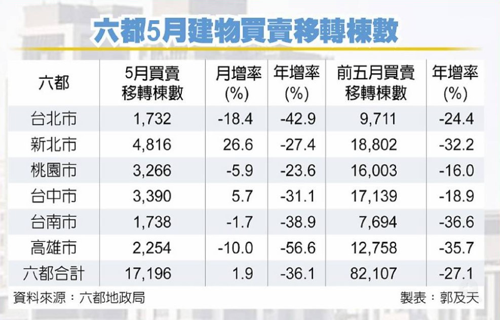 以今年前五月六都買賣移轉棟數觀察,六都合計為8.21萬棟、年減27.1%,創近八年同期新低紀錄,其中新北、台南、高雄衰退幅度均逾3成,台北市、台南創下八年新低,新北、高雄則是近九年最低交易量表現。