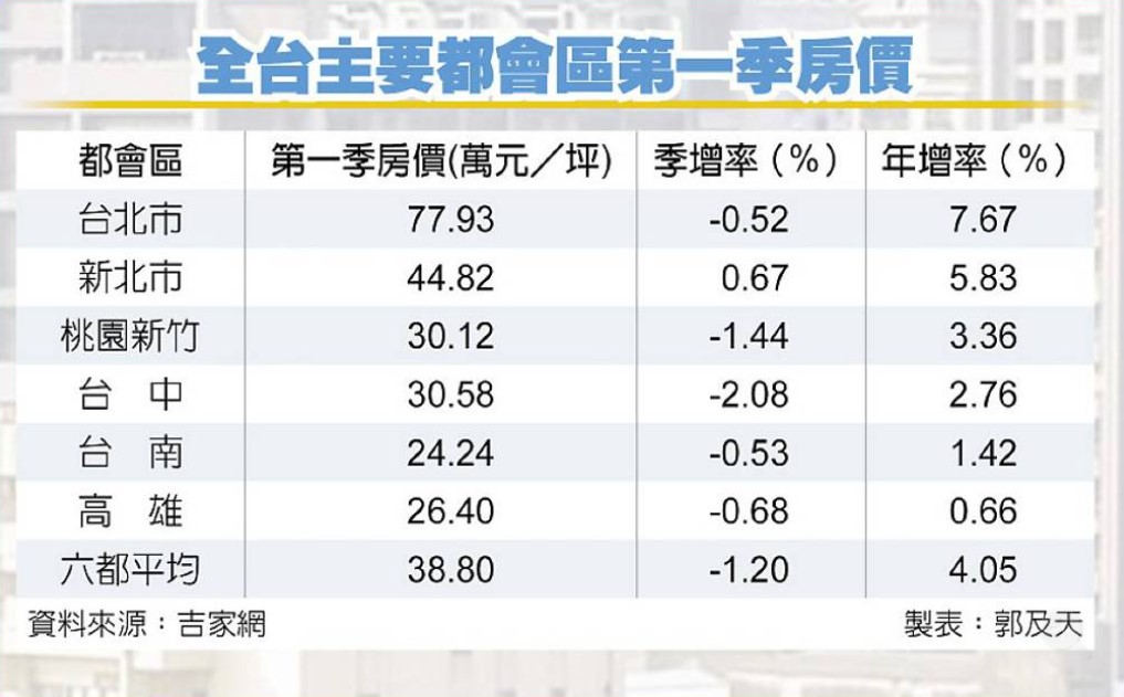 吉家網統計顯示,首季除新北市房價仍小漲0.67%外,其餘五都呈現小跌,不同於去年第四季由台南、高雄領跌,今年第一季改為台中、桃園領跌,依目前市場現況觀察,房價下修幅度不大,買方持續觀望,交易量就持續劇減,難以在短期內迅速回溫。