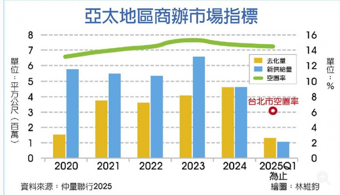 仲量聯行研究顯示,亞太地區辦公室市場今年第一季整體投資額比去年同期成長31%,達到164億美元;至於主要城市的辦公室空置率,平均約14.5%,台北市空置率則維持在6.4%低檔,競爭力相當強勁。