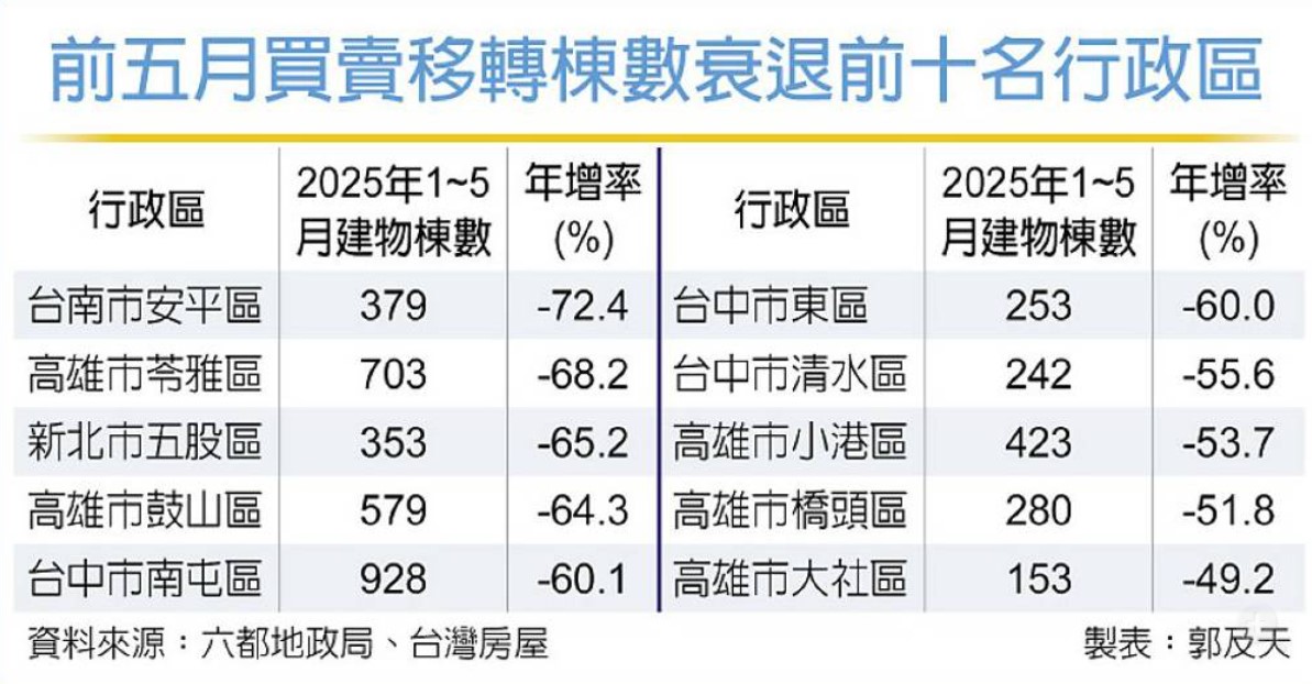 統計顯示,六都前五月買賣移轉合計8.21萬棟、年減27.1%,創近八年同期新低,其中包括高雄苓雅、鼓山、橋頭,台南的安定、安平,台中南屯、東區、清水,新北的五股等9個行政區地,交易量較去年同期腰斬。