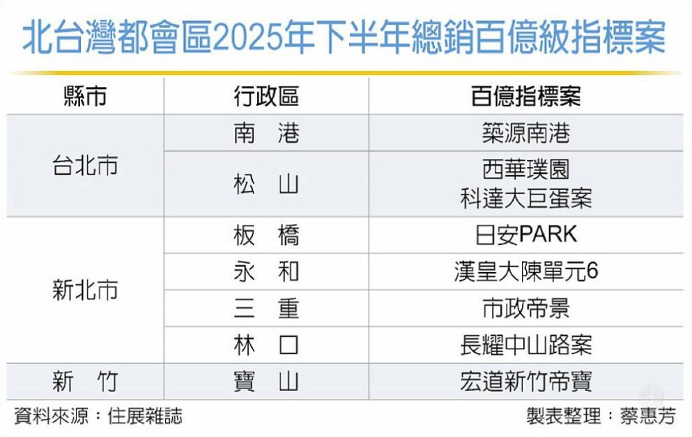 陳炳辰表示,下半年八大百億級大案,最大亮點為新竹總銷估破200億元的「宏道新竹帝寶」,不懼詭譎風雲進場。至於台北市,二大百億大案都是豪宅案,包括西華飯店危老重建案「西華璞園」,及2,000坪基地的大型都更案「築源南港」。新北市方面,四筆百億大案都位在房市熱區。其中總價偏高的大坪數案「長耀中山路案」,針對資產實力較佳的換屋族群;「日安 PARK」、「漢皇大陳單元6」、「市政帝景」規劃有小坪數戶別,可吸引首購與避險低預算買方。