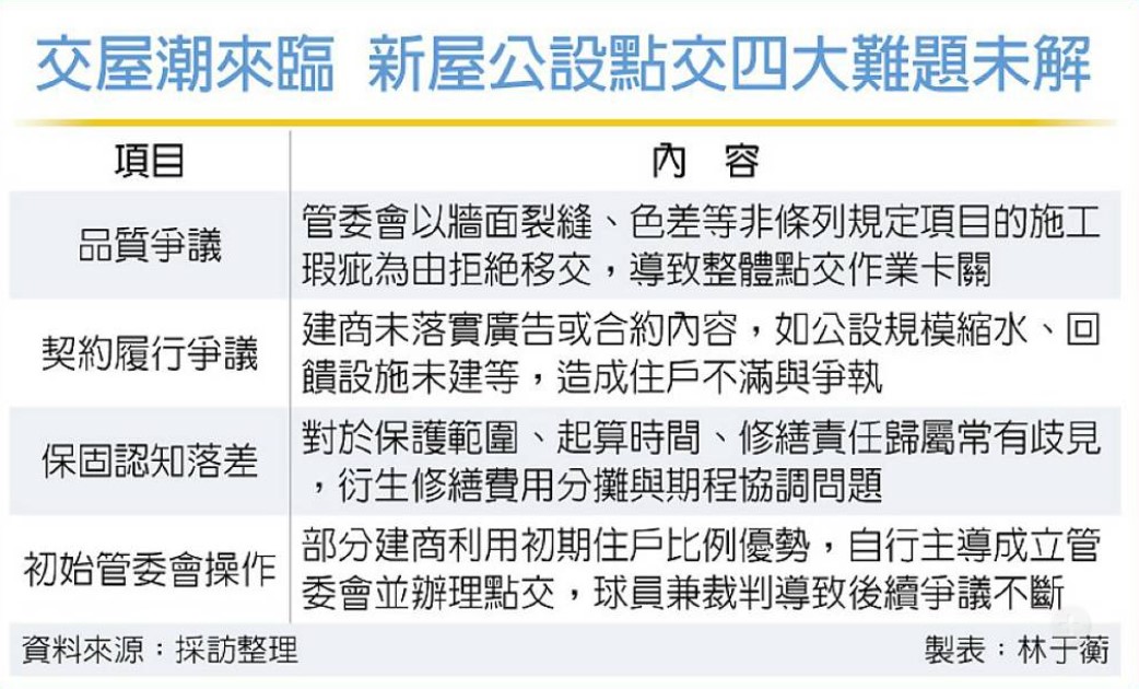 過去三年房市大好,建案遍地開花,隨時序進入完工交屋期,社區管委會與建商公設點交的消費爭議也層出不窮。內政部指出,目前點交制度面臨四大挑戰,列名首位的是品質爭議,管委會以牆面裂縫、色差等非法定檢測項目的瑕疵為由,拒絕移交。