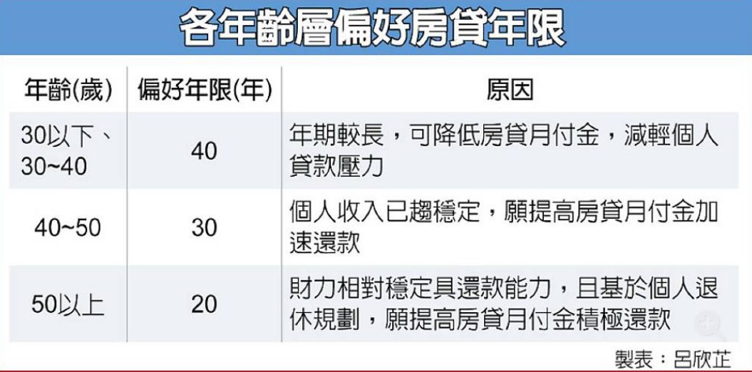 進一步從年齡層分析,兆豐銀行發現,不同年齡層對房貸年限的偏好呈現明顯差異,30歲以下、30歲~40歲族群偏好40年期,主要考量年期較長,可降低房貸的月付金以減輕還款壓力;40歲~50歲族群偏好30年期,因個人收入趨穩定,願意提高房貸月付金,加速還款;50歲以上族群偏好20年期,由於財力相對穩定,具還款能力,且基於個人退休規劃,提高房貸月付金積極還款。