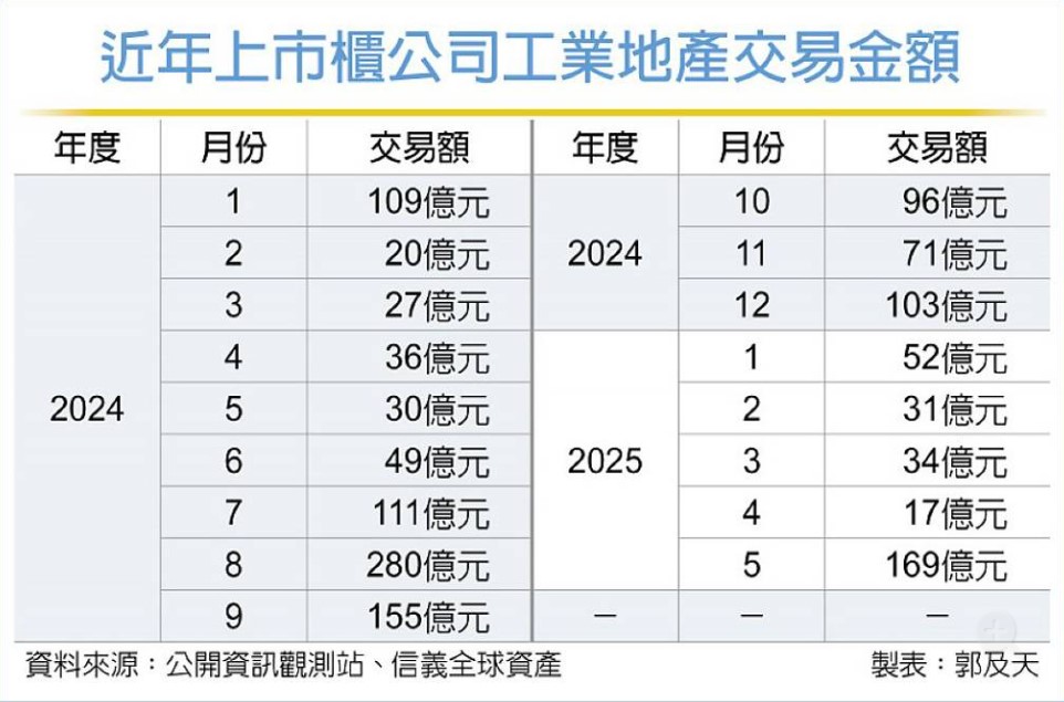 信義全球資產統計顯示,自去年第三季工業地產曾出現一波高潮,隨後沉寂了約三季,今年5月在關稅戰所引發的全球金融市場劇烈震盪趨於穩定後,上市櫃公司在國內工業地產交易量大幅成長至169億元,不少工業區都可見大型企業入手資產。