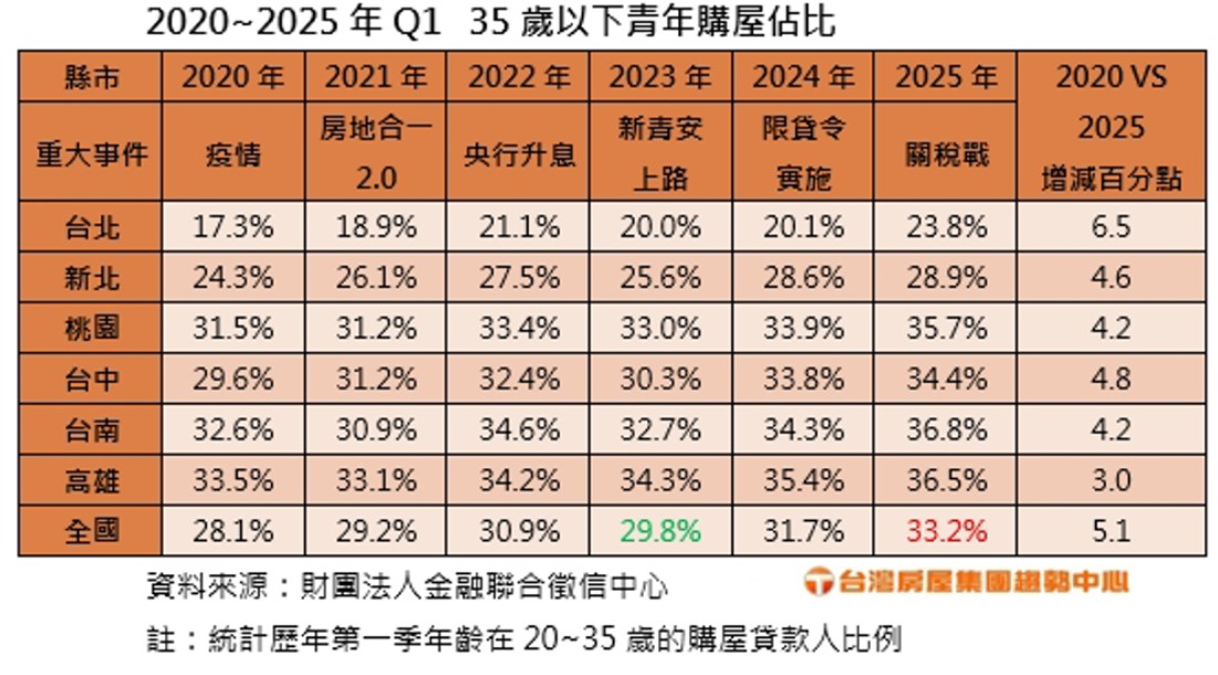 現在房市受限貸令的限制,交易降溫,不過年輕人仍是現在購屋主力,台灣房屋集團趨勢中心根據聯徵中心資料統計,2025年第一季全台35歲以下購屋族貸款,佔比達33.2%,也就是每三位購屋貸款人當中,就有一人是35歲以下的青年,其中六都除雙北外,其餘四都青年佔比都高於全台,尤其是台南、高雄青年的貸款佔比來到36%以上,已至少是近六年新高,使南二都成為「最敢買」的年輕族群代表。