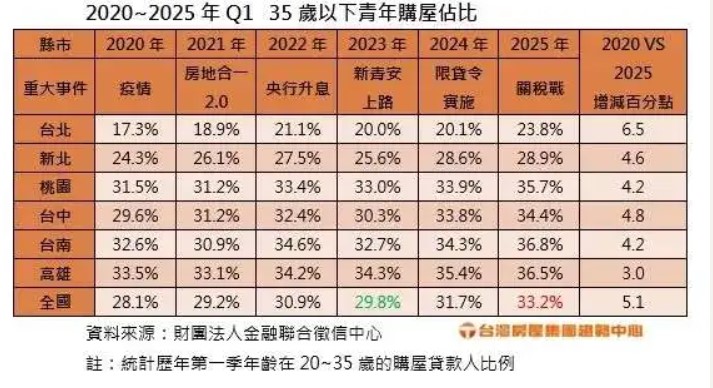 在高房價與限貸令雙重壓力下,台北市年輕人購屋意願仍穩步上升。根據台灣房屋集團統計,2025年第一季,35歲以下青年在台北市的購屋貸款佔比達23.8%,較2020年成長6.5個百分點,為六都成長幅度最大者。