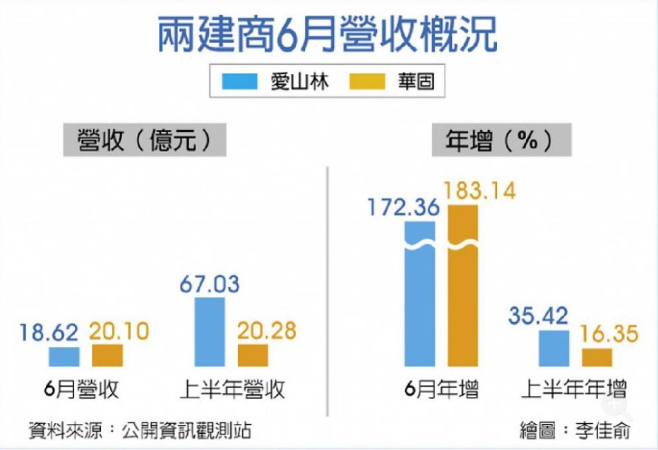 愛山林上半年營收令人驚艷,在全台代銷案,及自建案「屏東花園帝寶」交屋挹注下,6月營收大噴出、達18.62億元,年增幅達1.72倍,創下歷年同期次高紀錄;累計上半年營收手刀衝高!以67.03億元刷新史上同期新高紀錄。