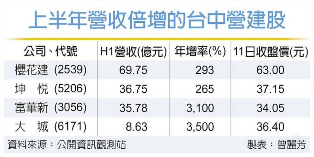 台中營建股上半年營收出爐,包括櫻花建(2539)、坤悅(5206)、富華新(3056)、大城(6171)等四檔,上半年營收繳出翻倍增長成績單,獲利成長可期。