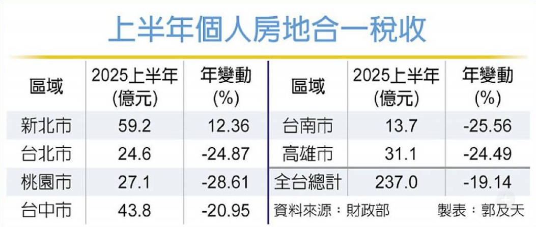 房市交投清淡、投資買盤退散、房價欠缺上漲動能,政府房地合一稅收下滑。根據財政部資料,6月全台個人房地合一稅收僅42.55億元,較去年同期大幅下滑35%,尤其雙北以南地區年減幅度都達4成以上最劇烈;累計上半年房地合一稅收237億元、年減19%,除新北市仍成長外,其餘五都年衰減幅都達2成以上,顯示房市交易動能明顯趨緩。