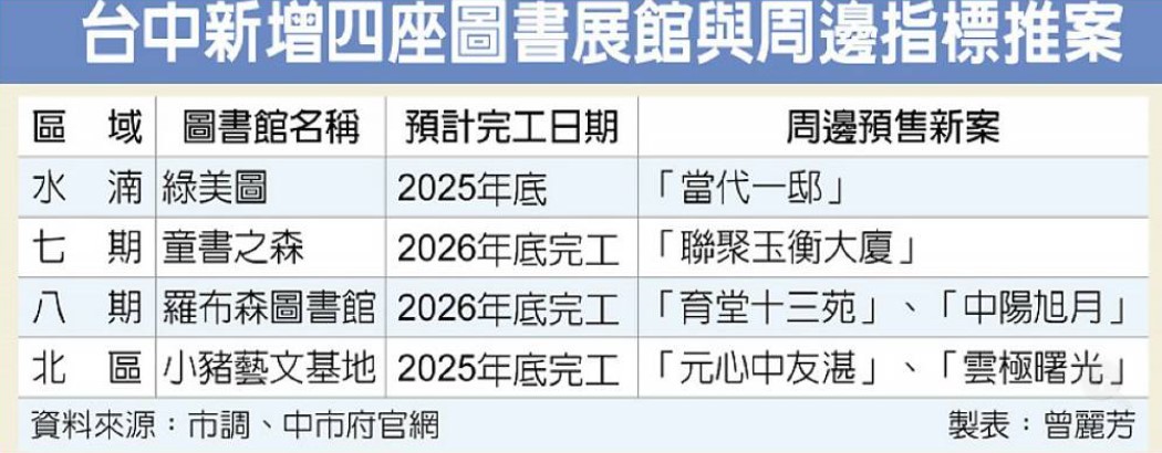 文化建設再推房市一波,台中再添四座新圖書館,成助漲周邊房價的重要建設。水湳經貿園區「綠美圖」將於12月13日開館,成為全台首座結合美術館與圖書館的公共藝文場域;民間企業積極響應,分別在七期、八期及北區,接連捐建三座風格獨具的私人圖書館,帶動高端客層在周邊置產的關注。