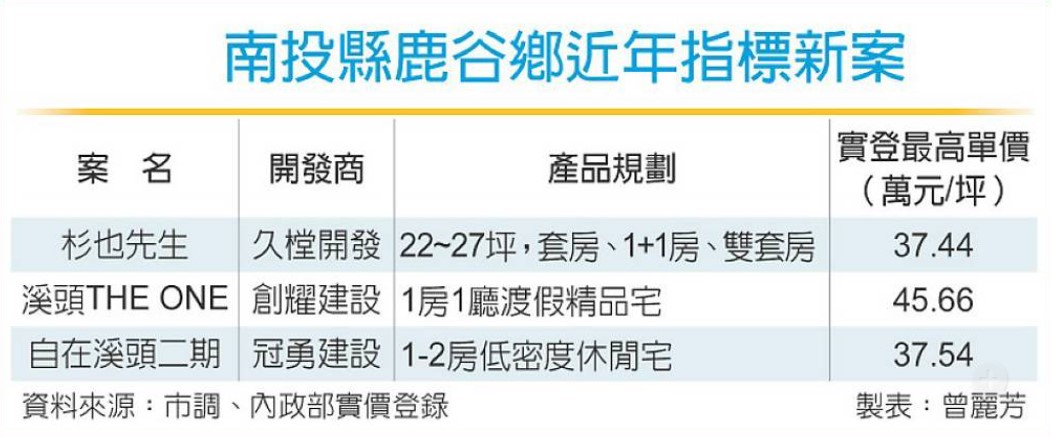 此外,鹿谷近年亦吸引許多建商搶進推案,如創耀建設推出的「溪頭THE ONE」,規劃為渡假精品宅,實登最高單價達45.66萬元;冠勇建設的「自在溪頭二期」,以高綠覆、低密度與簡約美學吸引退休族,實登最高單價37.54萬元。