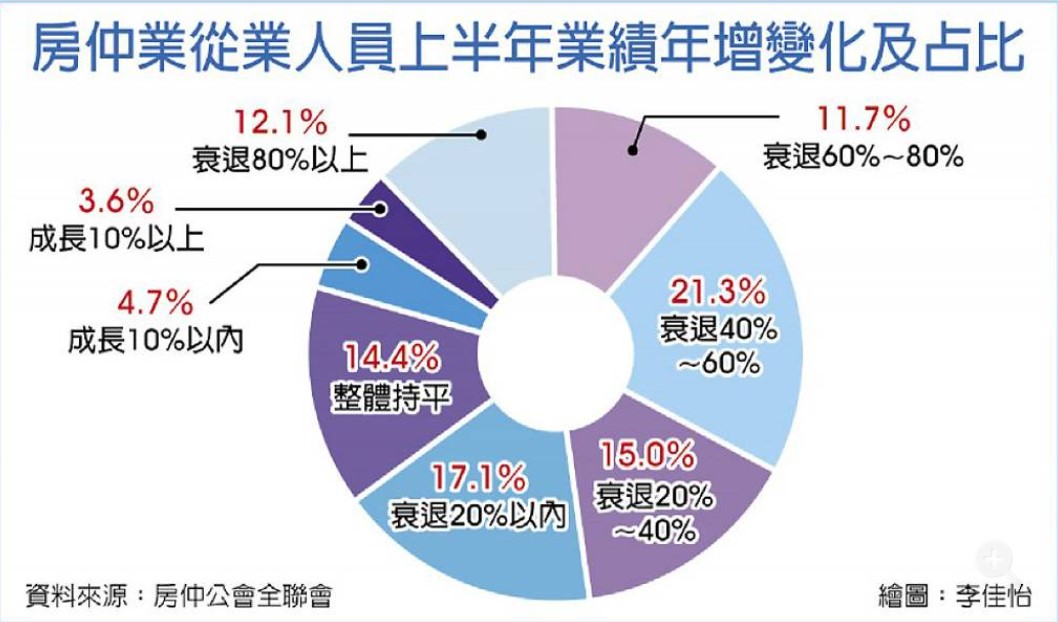 這份調查顯示,今年上半年與去年同期相較,業績衰退40%~60%的房仲業者占21.3%,衰退60%~80%占11.7%,衰退80%以上占12.1%;業績成長僅約占8.3%。此外,24.5%的非連鎖品牌房仲業者,業績衰退達80%以上。