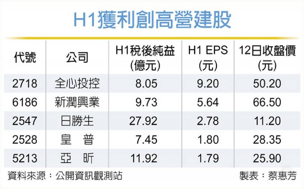 全心投控(2718)受惠新案交屋,上半年每股大賺9.2元,創同期新高,暫居營建股「EPS王」;新潤(6186)受惠北市南港「擎天森林」等大案等完工入帳,推升上半年稅後純益達9.74億元、年增1.87倍,EPS達5.64元創同期新高;亞昕(5213)在「擎天森林」等新案交屋貢獻下,上半年稅後純益、EPS分別達11.92億元、1.79元,新潤、亞昕上半年雙雙賺贏去年全年。