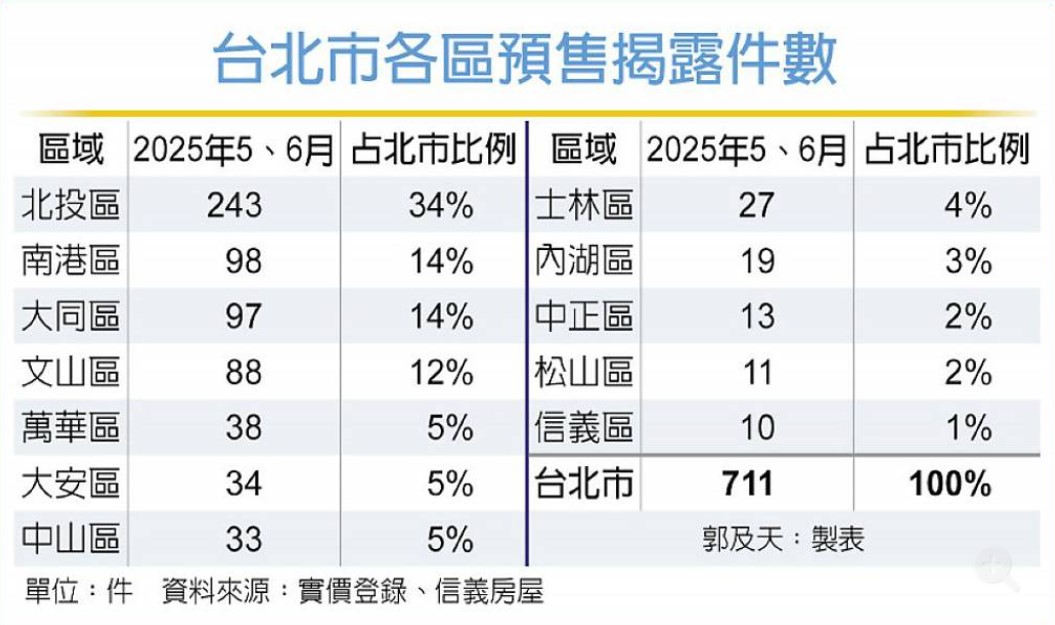 實價登錄統計顯示,台北市5、6月份預售屋交易合件711件,其中北投區即占34%,大幅超越其他行政區,其次為南港區、大同區近百件,文山區88件,台北市外圍蛋白區交易量明顯優於蛋黃區,如信義、松山、中正等區均僅十餘件,大安區僅30餘件。