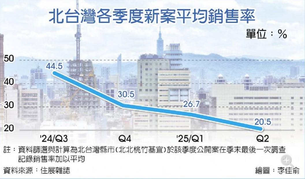 據《住展雜誌》調查,北台灣都會區預售屋及新成屋市場單季平均銷售率,從去年第三季金龍海嘯伊始的44.5%,逐季下探,去年第四季銷售率剩30.5%,今年第一季已掉到26.7%。今年第二季除政策緊縮、房貸排隊潮未解外,更殺出美國對等關稅和新台幣匯率急升等程咬金,買氣觀望氣氛更凝重,銷售率再下探至20.5%,較去年第三季幾乎腰斬;房市買氣急凍,不少新案單周平均業績,竟已「零成交」,呈現窒息量,市況已不可同日而語。再看今年第二季國泰房地產指數,全台30天平均銷售率已掉到6.37%,創下近16年新低點。