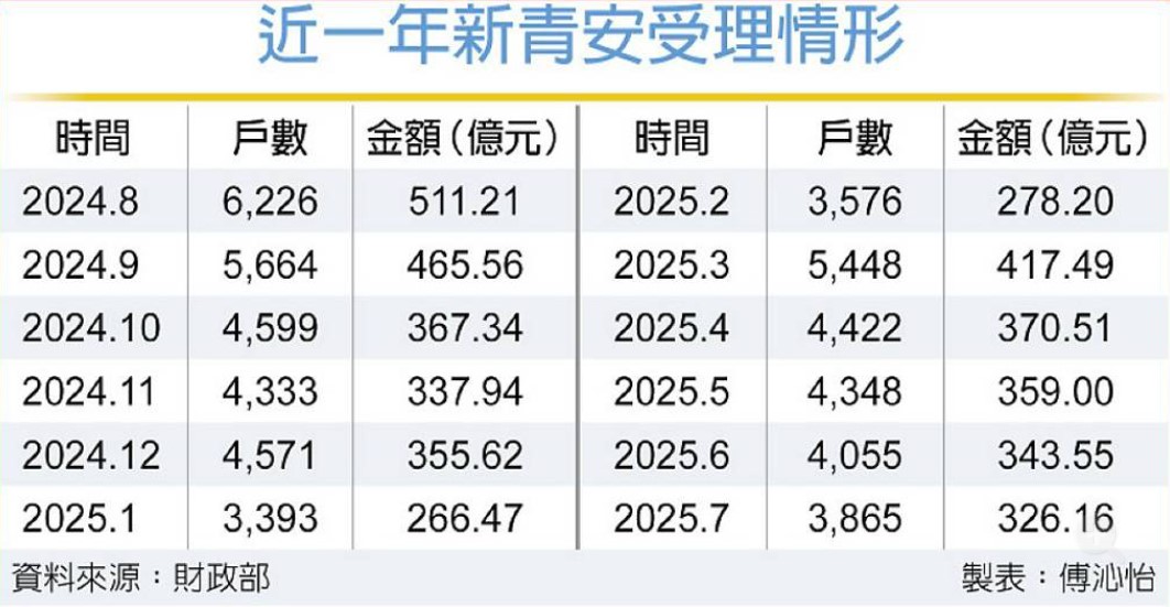 國庫署統計,7月新青安受理戶數3,865戶、受理金額326.16億元,月減幅度都在5%上下,相較去年同月的年減幅度則高達4成。官員表示,除了供需,另一影響新青安的因素是利息補貼明年7月底將到期,未來民眾資金負擔可能加重。