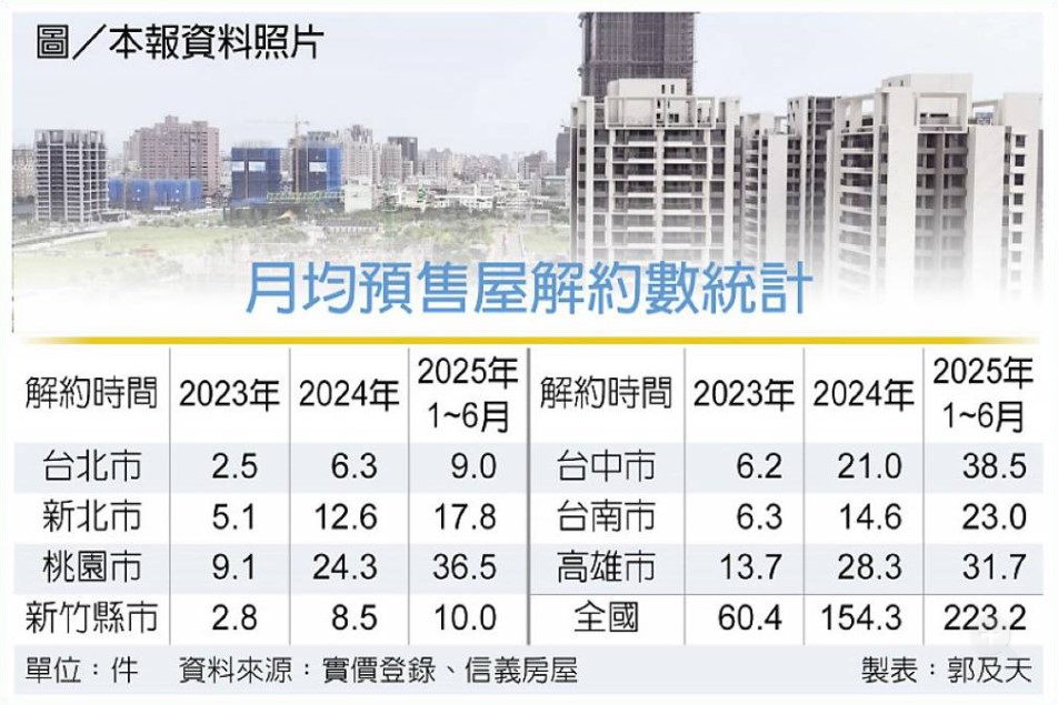 統計顯示,2023年時平均每個月僅有60件預售屋解約,去年提升至154件,今年進一步增加至223件,雖對比過去的成交件數,目前預售屋解約比例還不到2%,不過在今年4月股災之後有逐漸增加的趨勢,也反映市場對房產後市更趨悲觀。