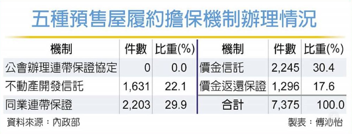 預售屋買賣履約期間長,為避免建商在預售期間發生財務問題或工程延宕,導致購屋民眾受損,內政部現行預售屋買賣定型化契約訂有五種履約擔保機制,目前以採用「不動產開發信託」及「價金信託」合計達52%居多。