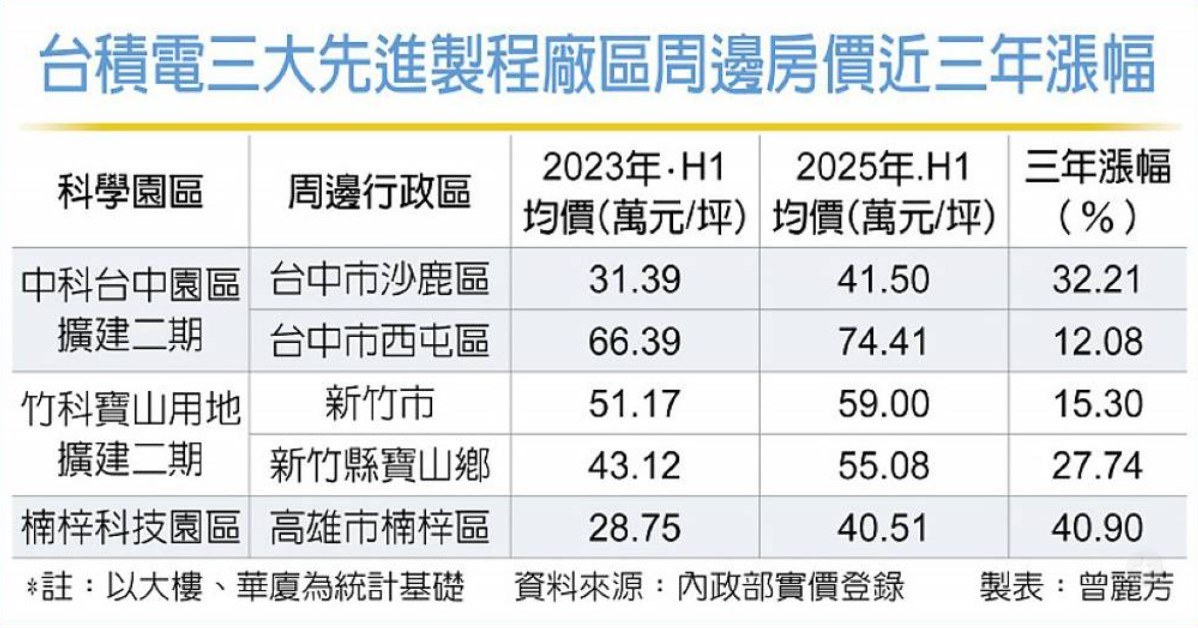 台積電持續擴建先進製程產能,帶動三大科學園區周邊房市交易熱度。據實價登錄統計,台中沙鹿、高雄楠梓近三年上半年預售屋均價漲幅逾3成,顯示科技業設廠效應已直接反映在區域房價。