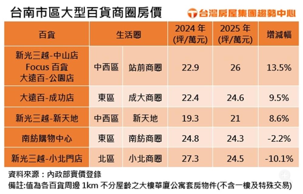 不過,李吟蔚指出,雖然面臨大環境不利因素,但仍有台南市的百貨商圈,展現強勁抗跌力,例如坐擁新光三越中山店、Focus及大遠百公園店,三大百貨集結的火車站前商圈,房價表現就很給力,區段房價今年每坪均價來到26萬元,年漲幅約13.5%,另外,大遠百成功店所屬的成大商圈,及新光三越台南新天地周邊房價,也分別有9.5%和8.6%的漲幅。