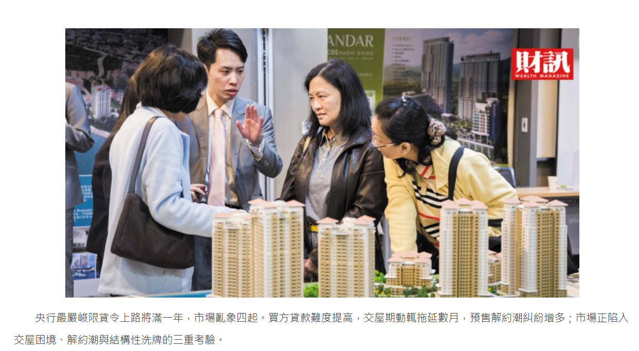 根據《財訊》雙週刊報導,第七波信用管制自去年920上路以來,亂象持續升溫,史上最大交屋潮正逢最嚴峻的貸款緊縮,市場隱憂逐漸浮上台面。