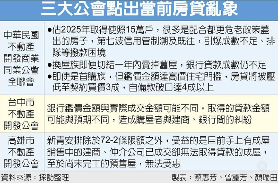 中華民國不動產開發公會全聯樂見行政院正視房貸排隊潮問題,但強調房市當前有三大類貸款戶亟待解決,一、今年取得使照完工交屋估約15萬戶,很多是配合都更危老政策重建完成的房子,但中央銀行第七波信用管制溯及既往,引爆成數不足、排隊等撥款困境。二、換屋族縱然切結一年內賣掉舊屋,銀行不願找麻煩,仍然貸款成數不足;三、即使是首購族,只要銀行鑑價金額達到高價住宅門檻,房貸只能被壓到契約買價的3成,如此一來一交屋,馬上出現4成以上的資金破口。