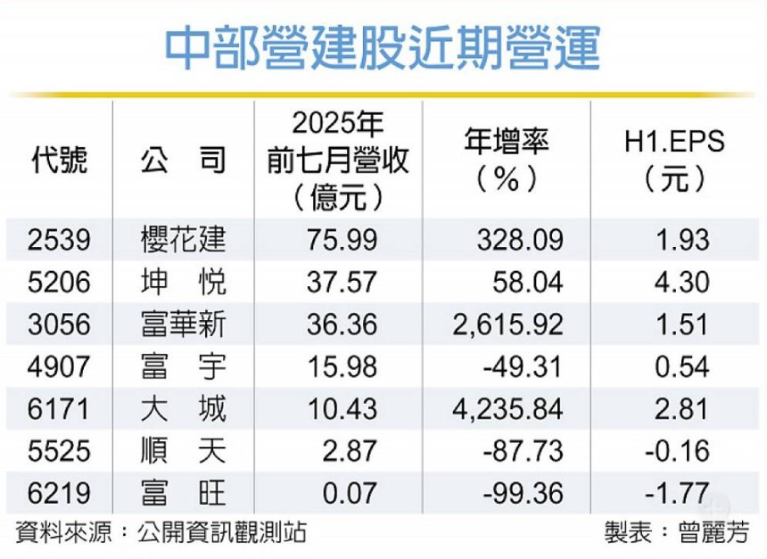 法人分析,包括櫻花建、坤悅、富華新(3056)、大城(6171),上半年均受惠交屋潮挹注,獲利表現亮眼。隨著下半年進入交屋高峰期,櫻花建、坤悅、順天(5525)、富旺2025年營收獲利將全面超越2024年。