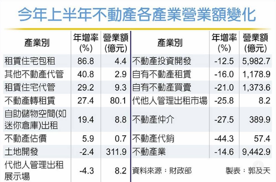 去年9月央行針對不動產實施第七波信用管制,掀起「金龍海嘯」迄今近一年,房市交易量急凍,不動產業產值隨之萎縮。據財政部統計顯示,今年上半年不動產業總營業額為9,443億元、年減14.6%,各相關行業中,又以末端銷售的代銷、仲介業營業額分別年減44.3%、27.5%受衝擊最大,租賃管理相關產業在政策扶持與市場需求旺盛下,營業額仍普遍成長。