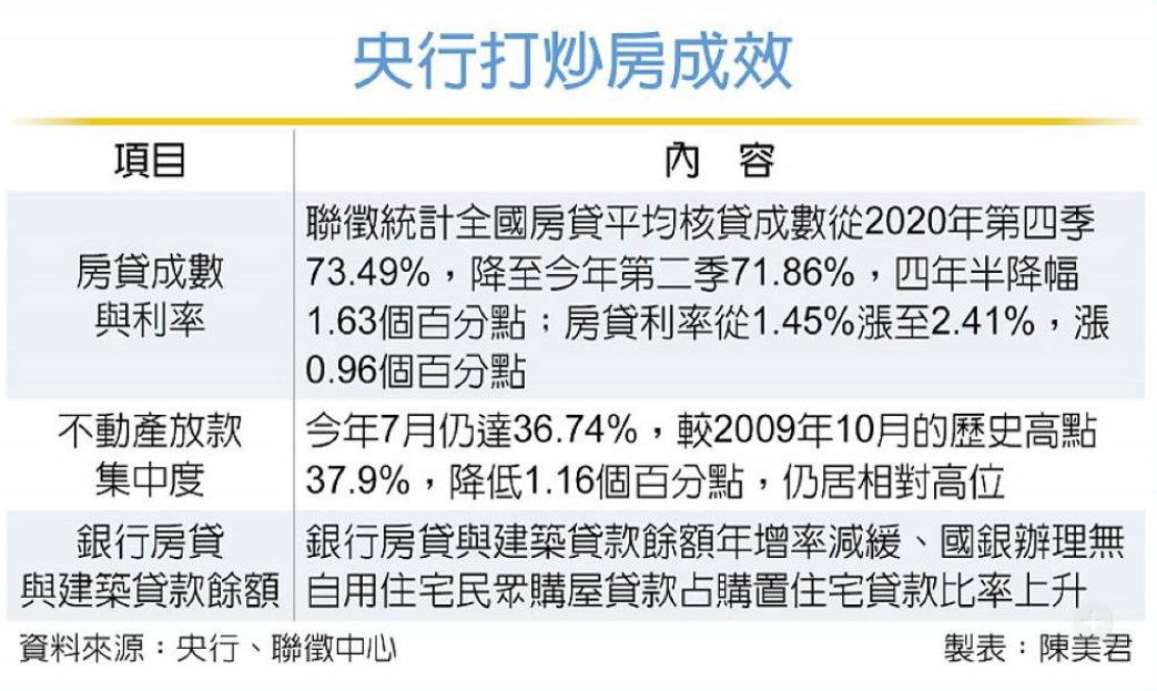 數據顯示,央行實施近五年的打炒房措施,確實讓房市逐步恢復冷靜,但央行最關注的房市指標「不動產貸款集中度」,截至今年7月仍達36.74%,雖較2009年10月的歷史高點37.9%,降低1.16個百分點,仍居相對高位,成為央行持續控管房市的關鍵主因。