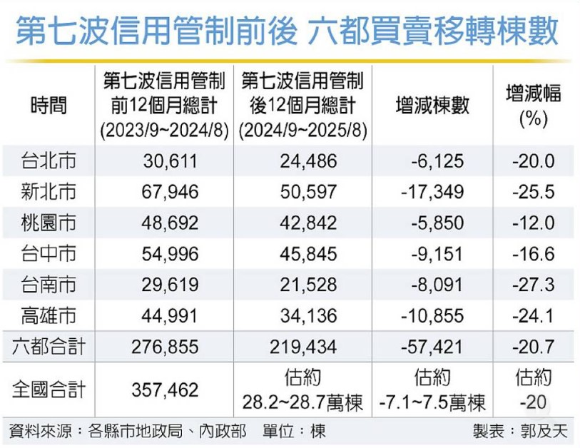 根據統計顯示,在去年9月第七波選擇性信用管制的前一年,全台買賣移轉棟數35.7萬棟,不過在去年9月至今年8月間,預估僅有28萬餘棟。